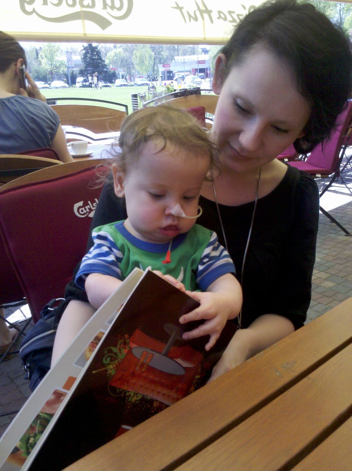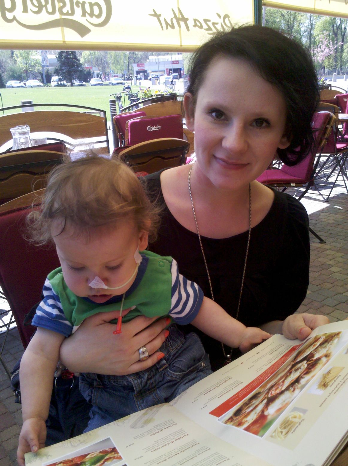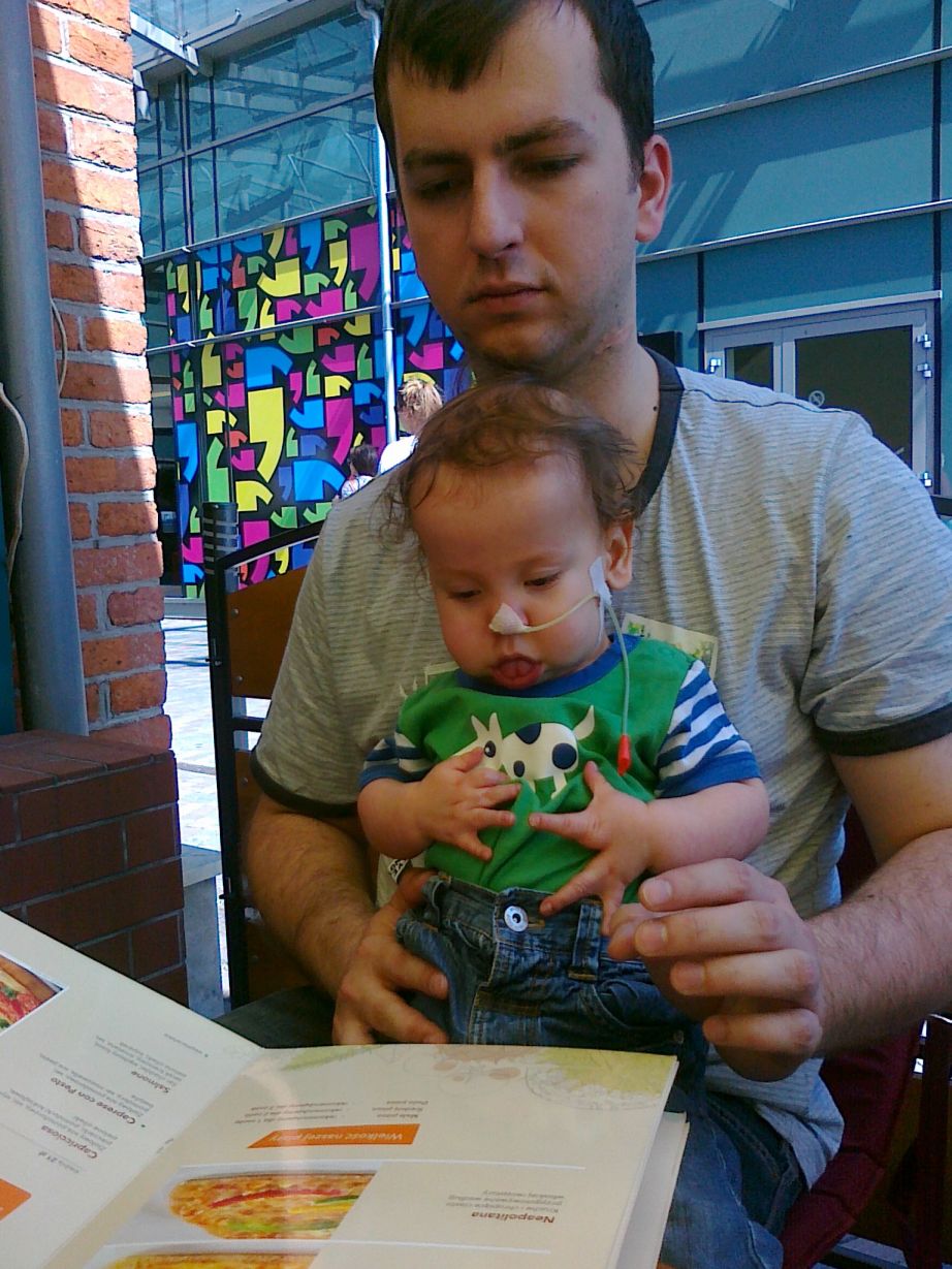 Kraków dzisiaj był pięknie ogrzewany przez słońce, w związku z czym Błażej mógł się lansować w pizzerii, co bardzo mu się podobało. Mimo że sam jadł swojego kurczaczka słoikowego, bardzo chętnie służył nam pomocą w wyborze dań. Karta dań okazała się zabawką dnia. A kiedy tylko dostaliśmy jedzonko, jak na zawołanie poszedł spać. I obudził się dopiero podczas przekładania do auta. Coraz bardziej ludzkie stworzenie się z niego robi.