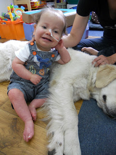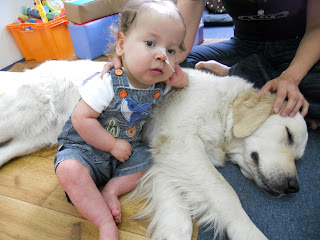 I ostatnie, co robimy, to dogoterapia, czyli dotykanie, głaskanie pieska Yoko. Błażej nie lubi go tylko karmić, bo mu zapach jedzonka nie odpowiada, za to położyć się na piesku to jest coś!