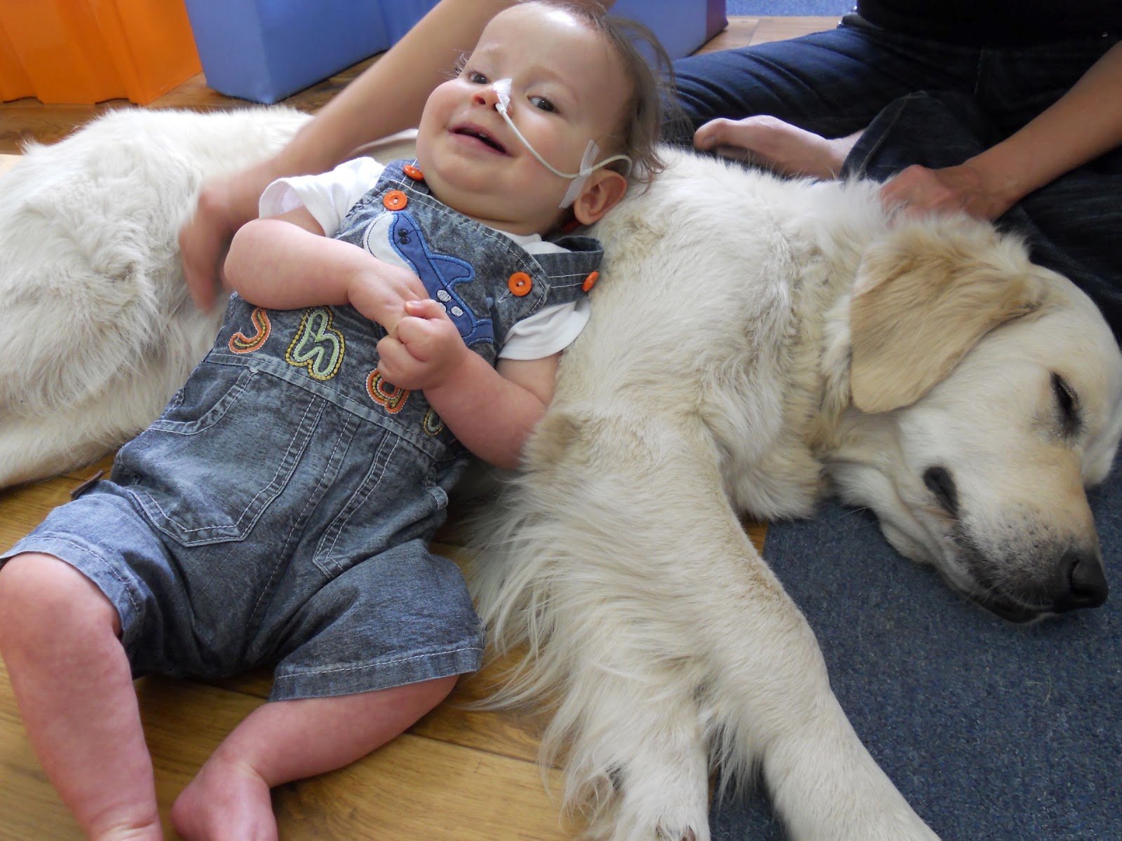 Dwa razy dziennie po 45 minut ćwiczy Błażuch z panią rehabilitantką, są to te gorsze chwile w ciągu dnia. Pierwsza część zajęć to po prostu ćwiczenia, druga to stanie w kombinezonie Dunag02 , gdzie dzieci w specjalnej uprzęży (wyglądającej jak sprzęt do skakania ze spadochronem) wiszą w klatce i walczą z grawitacją. Myślałam, że Błażej nie nadaje się do takiej terapii, że za mało umie, ale wcale nie, pani go chwali. Niestety nie robi to na nim wrażenia, krzyczy w niebo głosy, a wczoraj nawet opluł (tak!specjalnie!) panią rehabilitantkę. Paskidne, wiem, ale powiedziała, że to zachowanie adekwatne do jego wieku, więc właściwie się cieszę, że tak normalnie, jak inne dzieci, prawie dwuletnie, reaguje.