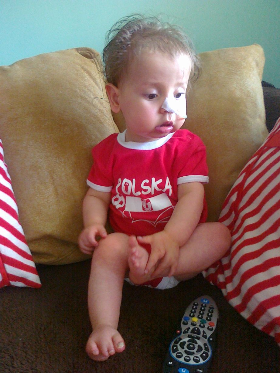 Mięliśmy nie dać się wciągnąć w narodowe szaleństwo piłkowe. Ale cóż, Błażej nas przekonał, okazał się być zagorzałym kibicem piłki nożnej. Zachwycony prezentem od babci, w postaci patriotycznego body, powiedział, że nie zamierza zdjąć go do końca Euro. Nie wiem jeszcze,czy się zgodzić, ale właściwie, czemu nie, skoro chce być taki trendy.