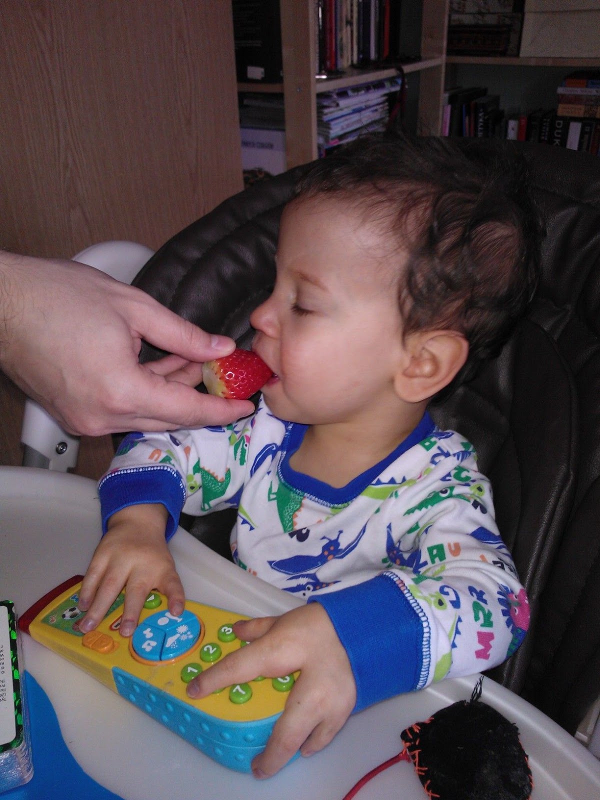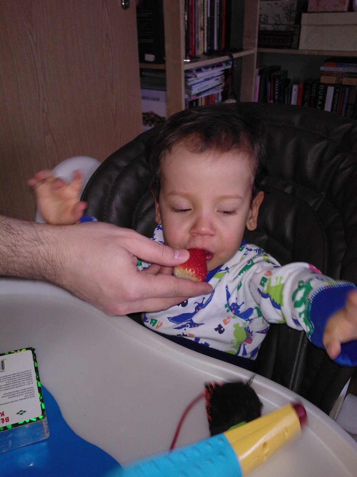 A w weekend próbował pysznych, chociaż trochę bezsmakowych (no, ale czego oczekiwać w lutym) truskawek: