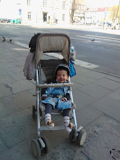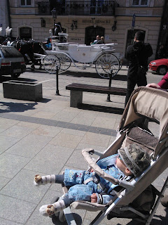 I oto wybrał się na obiad. Najpierw jednak przespacerował się po Plantach, obejrzał bryczki i koniki, powdychał trochę zdrowego miejskiego powietrza. I wszystko byłoby cudownie, gdyby nie podróż tramwajem. Bowiem nowością było także jechanie tym ulubionym przeze mnie środkiem komunikacji miejskiej. Błażejowi jednak się BARDZO nie spodobało. Płakał, krzyczał i złorzeczył (tym razem dobrze, że jeszcze wszystko w swoim języku). W drodze powrotnej było ciut lepiej, ale do przyjemnej niedzielnej wycieczki tramwajem jeszcze sporo brakowało.