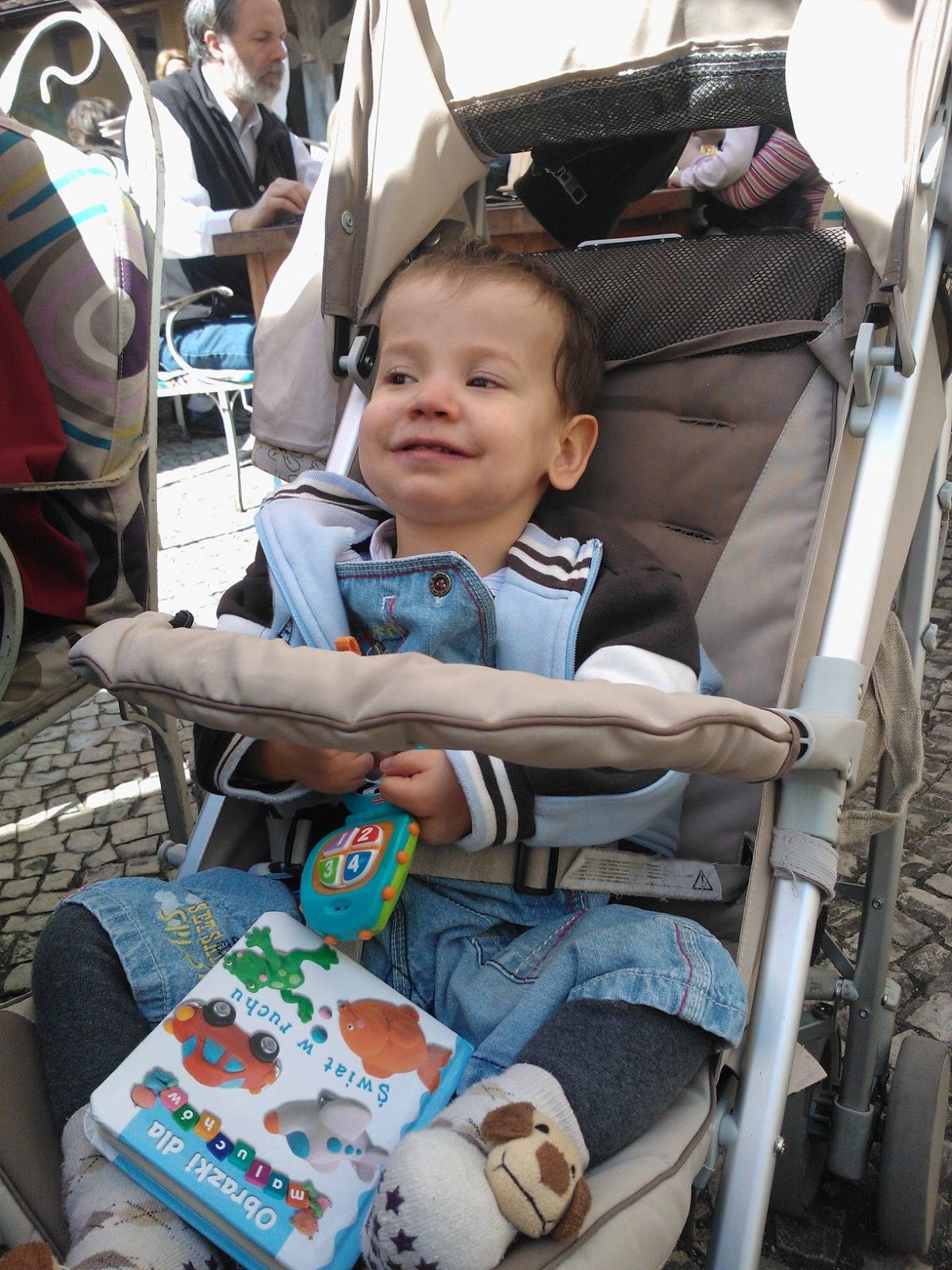 I oto wybrał się na obiad. Najpierw jednak przespacerował się po Plantach, obejrzał bryczki i koniki, powdychał trochę zdrowego miejskiego powietrza. I wszystko byłoby cudownie, gdyby nie podróż tramwajem. Bowiem nowością było także jechanie tym ulubionym przeze mnie środkiem komunikacji miejskiej. Błażejowi jednak się BARDZO nie spodobało. Płakał, krzyczał i złorzeczył (tym razem dobrze, że jeszcze wszystko w swoim języku). W drodze powrotnej było ciut lepiej, ale do przyjemnej niedzielnej wycieczki tramwajem jeszcze sporo brakowało.