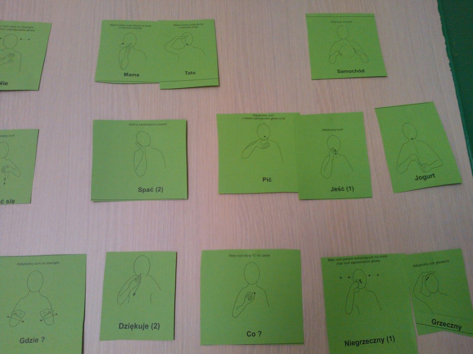 Mamy postanowienie uporać się po operacji serduszka z Błażejkowym języczkiem. Żeby było dobrze trzeba podciąć wędzidełko, które się pod nim znajduje. Powinny się wtedy poprawić sprawy żywieniowo-mówieniowe. A na razie próbujemy uczyć się Makatonu. Ja się trochę podszkoliłam i już mniej więcej wiem, jak się do tego zabrać. A więc, najpierw musimy się zdecydować, czy Bła woli gesty, czy znaki (bo Makaton z tych dwóch możliwości się składa). Oczywiście można próbować robić obie rzeczy na raz, ale lepiej skupić się na jednej. Wybieramy więc gesty(na razie,nie wiem, czy to się uda) i machamy Błażejkowi przed oczami różne rzeczy, na razie dotyczące kilku, najważniejszych wg mnie, pojęć. Oczywiście najpierw sami musimy się ładnie nauczyć: