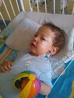 Infekcja nadal Błażusia się trzyma, antybiotyki jakoś nie mogą sobie poradzić. Ale dostanie inne, może w końcu pomogą. Odmówił spożywania szpitalnego jedzenia, więc przynosimy mu jego ulubione dynie z indykiem i serki homogenizowane i coś tam je dzięki temu. Za to jest w coraz lepszym humorze, dzisiaj nawet bił brawo i bawił się grzechotką. Jest to dla niego duży wysiłek, ale ma coraz większa ochotę na „niespanie”. A oto jak się prezentuje: