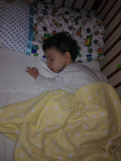 A Błażejuś się śmieje, bawi i śpi pod swoim kocykiem:) Jednym z plusów pobytu Błażejowego w szpitalu jest to, że korzysta z poduszki i koca, czego wcześniej nie uznawał. Wydaje mi się też, że mniej się poci, wcześniej nawet podczas snu serduszko dawało znać, że się męczy, teraz głowa nie jest zawsze mokra.
