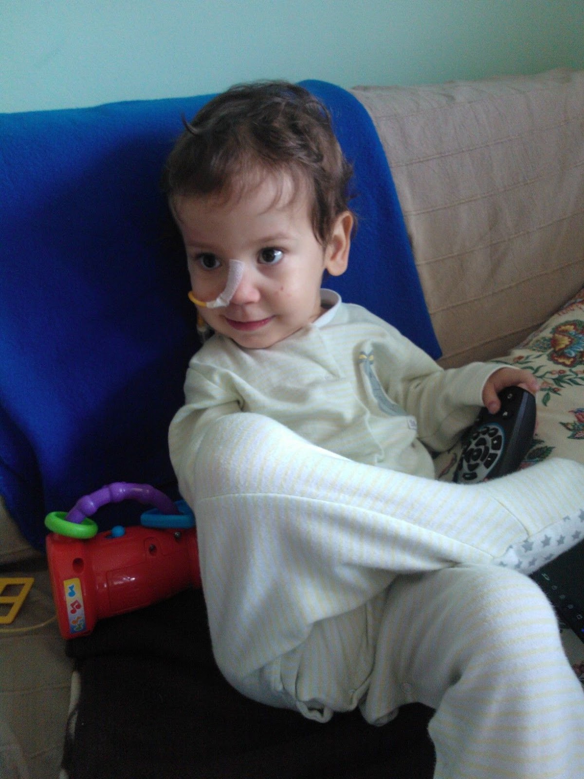 Więc tak, aktualnie Błażej nie je prawie nic buzią. Ma sondę, bo założyli mu żeby przytył i na razie ma mieć, bo nie jest w stanie zjeść takiej ilości, jaką powinien. Je teraz sondą po siedemdziesiąt mililitrów przez dwadzieścia godzin na dobę. Próbujemy mu coś dawać buzią, ale na razie nie jest to dużo. Przy wypisie ważył 7,7 kg. Zobaczymy, za jakiś czas, czy tuczenie działa:) Poza tym podejrzewam, że o drugiej  w nocy miał robioną inhalację, albo podawane jakieś leki, które go budziły. Albo u sąsiada coś robili. Bo wstaje o drugiej i koniec. Czas na zabawę:)