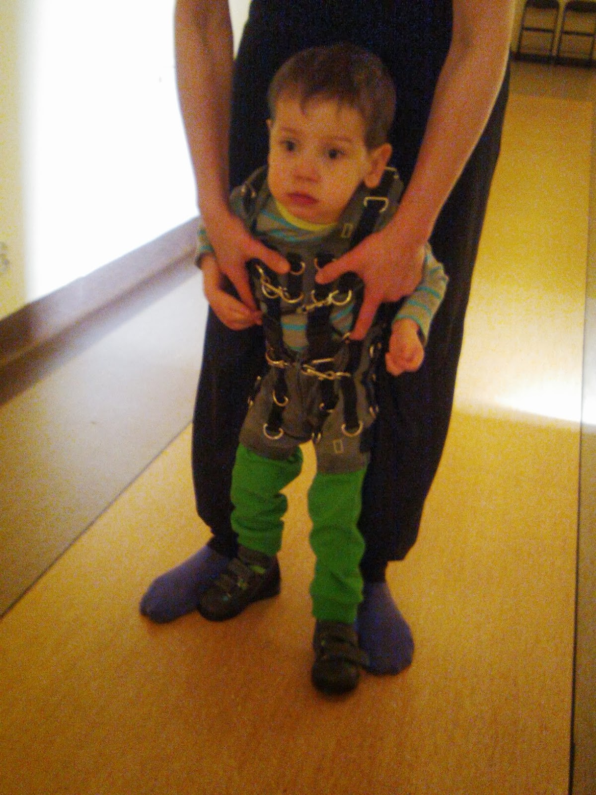 Błażej nadal bardzo dzielnie uczestniczy we wszystkich ćwiczeniach. Okazuje się, że nie ma dużych problemów z integracją sensoryczną. Czyli już ładnie sobie radzi z różnymi, dziwnymi dla niego, fakturami, nie ma odruchu wymiotnego na zapachy, nie brzydzi go kisiel, ani plastelina. Głównym problemem w tej materii jest nadwrażliwość w okolicy buzi. Oczywiście problemy z dziąsłami robią swoje, ale pani terapeutka zwróciła uwagę, że ciągłe trzymanie rączki w buzi musi znaczyć coś więcej.