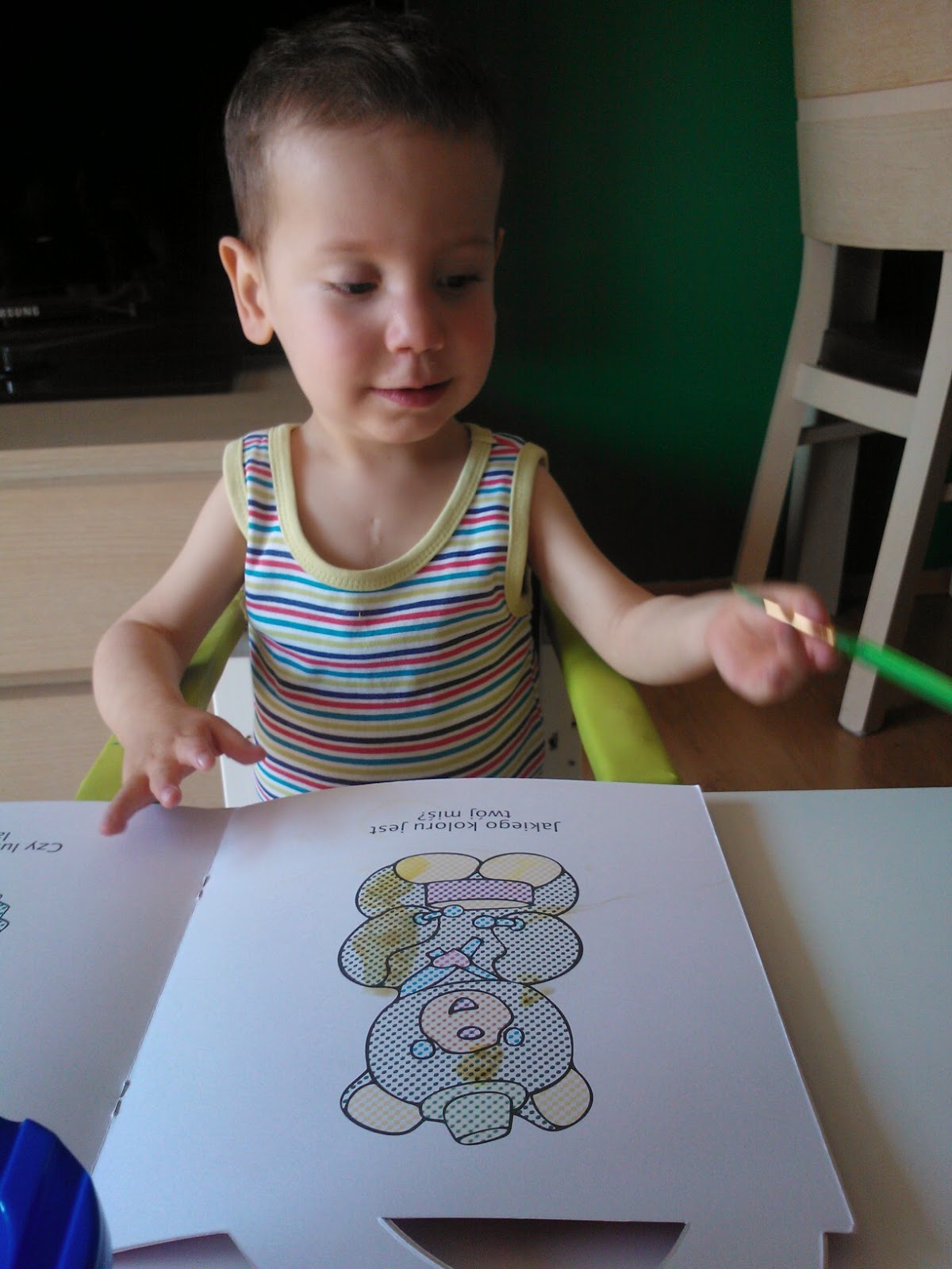 Błażejkowi minął kolejny tydzień bez przedszkola. W tym czasie bardzo ładnie ćwiczył, jeździł na  koniu, codziennie miał jakieś zajęcia. A w domu znalazł swoją ulubioną aktywność artystyczną, czyli malowanki wodne. Wystarczy woda, pędzel i piękny obrazek gotowy. Na farby i kredki chwilowo jest obrażony. Z nowości smakowych przekonujemy go, że kakao to pyyyszna rzecz. Na razie entuzjazm ze strony Błażeja jest umiarkowany:)