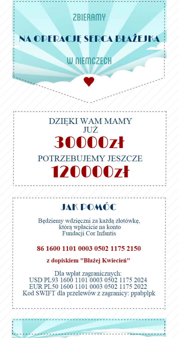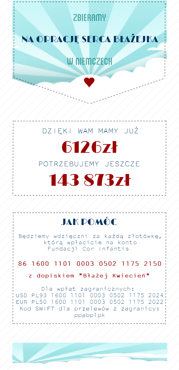 Na Błażejkowych subkontach już trzydzieści tysięcy:) Dziękujemy i niezmiennie prosimy o więcej:)
