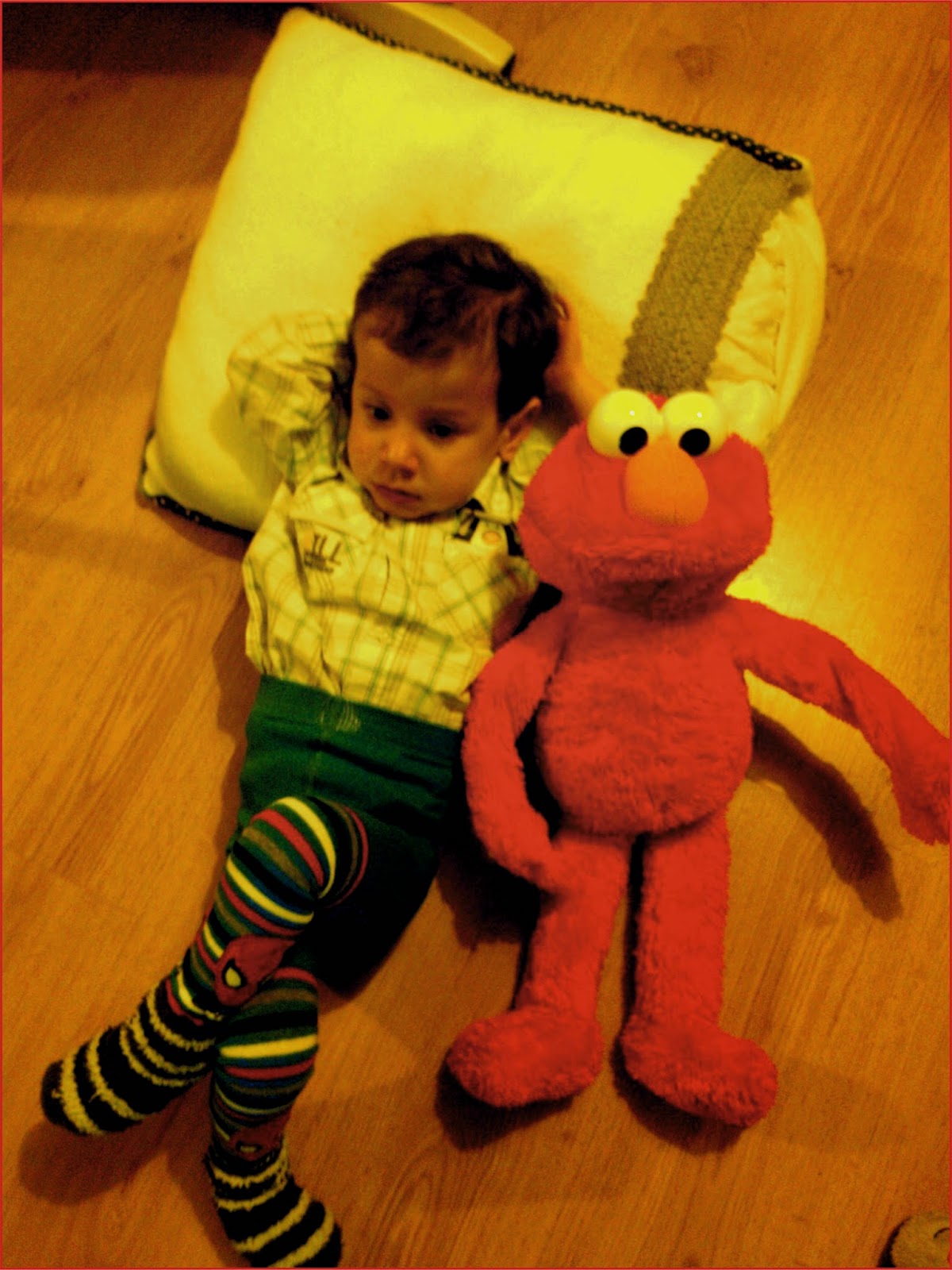 Elmo śpiewa, przytula i chrapie, ja go uwielbiam! A Błażej na razie tylko akceptuje i się do niego uśmiecha:) – a na tym zdjęciu oczywiście oglada „Świat według Elma”.