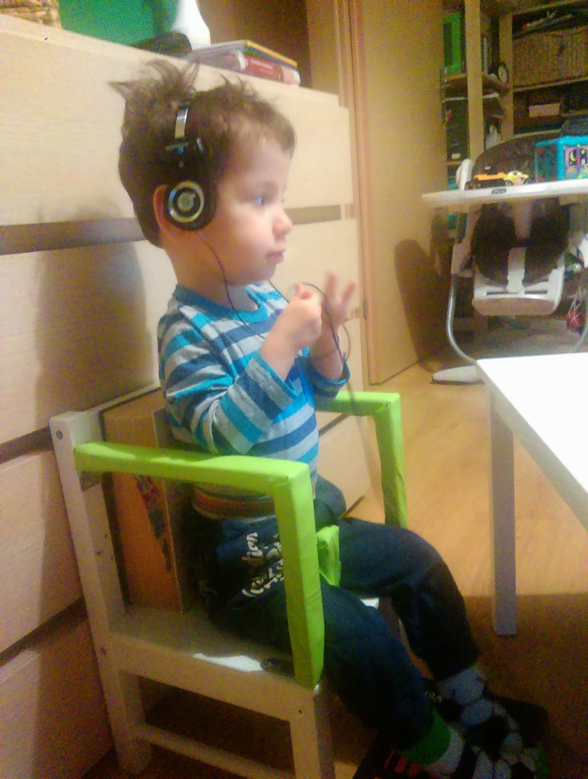 Błażej nie potrafi kontrolować się na tyle, żeby nie zsunąć się z normalnego krzesła, więc musi być przed tym zabezpieczony, także po bokach. Poza tym oryginalnie siedzisko było za wysokie, więc trzeba było mu skrócić nogi. Jest też trochę za głębokie dla Błażejka, ale tutaj pomaga gruba książka. Podobna musi być też pod stopami, żeby zawsze dotykały podłoża. Grubość książek zmienia się wraz z rośnięciem Błażeja:)