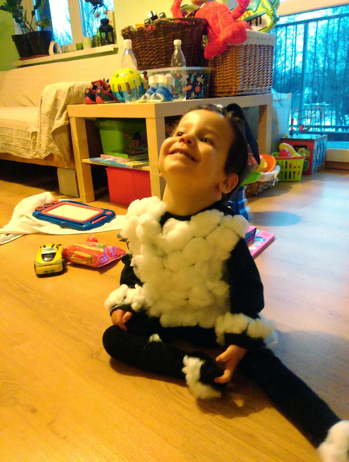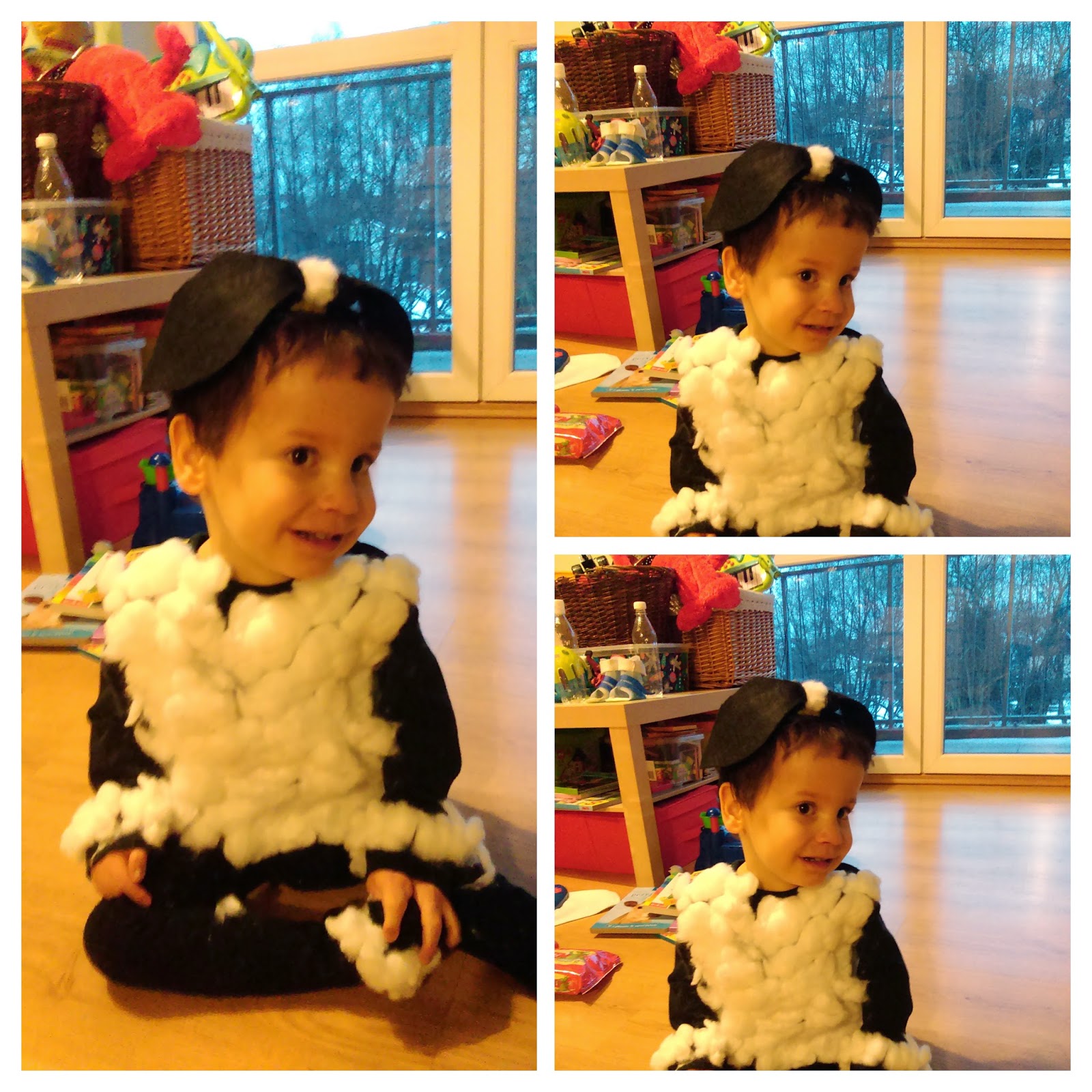 A na razie siedzimy zamknięci w domu, więc Błażej oczywiście nie chodzi do przedszkola. I w związku z tym przegapił niestety bal przebierańców. Rok temu był piękną pszczółką, a w tym miał być uroczą owieczką. Niestety choroba pokrzyżowała mu plany imprezowe, ale to nic, z rodzicami też można się dobrze się bawić! Zrobiliśmy sobie dzisiaj mini bal, a ja (znów będę się chwalić) bawiłam się w kostiumologa:) Oto, co jest potrzebne do zrobienia kostiumu owieczki: