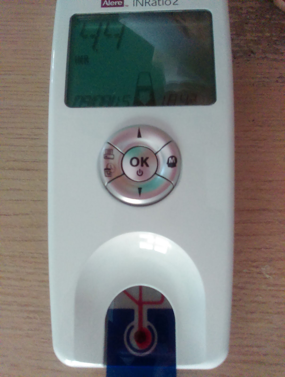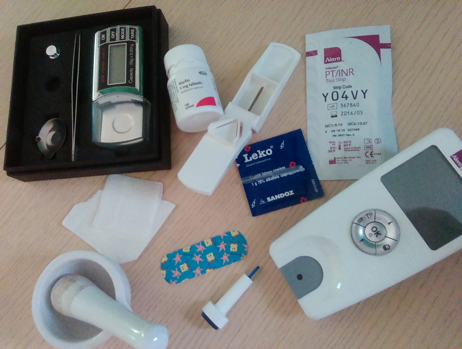 Jedno z lekarstw, które zażywa to warfaryna. Niestety bardzo trudno jest ustalić jej odpowiednią dawkę (za mała grozi skrzepem, za wysoka krwotokiem). Z tego powodu Błażejek codziennie ma wykonywane badanie INR, które pokazuje, jak danego dnia krzepnie jego krew. Na podstawie tego wyniku każdego dnia ustalamy dawkę warfaryny. Badanie wygląda mniej więcej tak, jak badanie poziomu cukru u chorych na cukrzycę. Błażejek jest bardzo dzielny, w ogóle nie płacze, gdy wykonujemy pomiar i nawet pozwolił na małą sesję:)