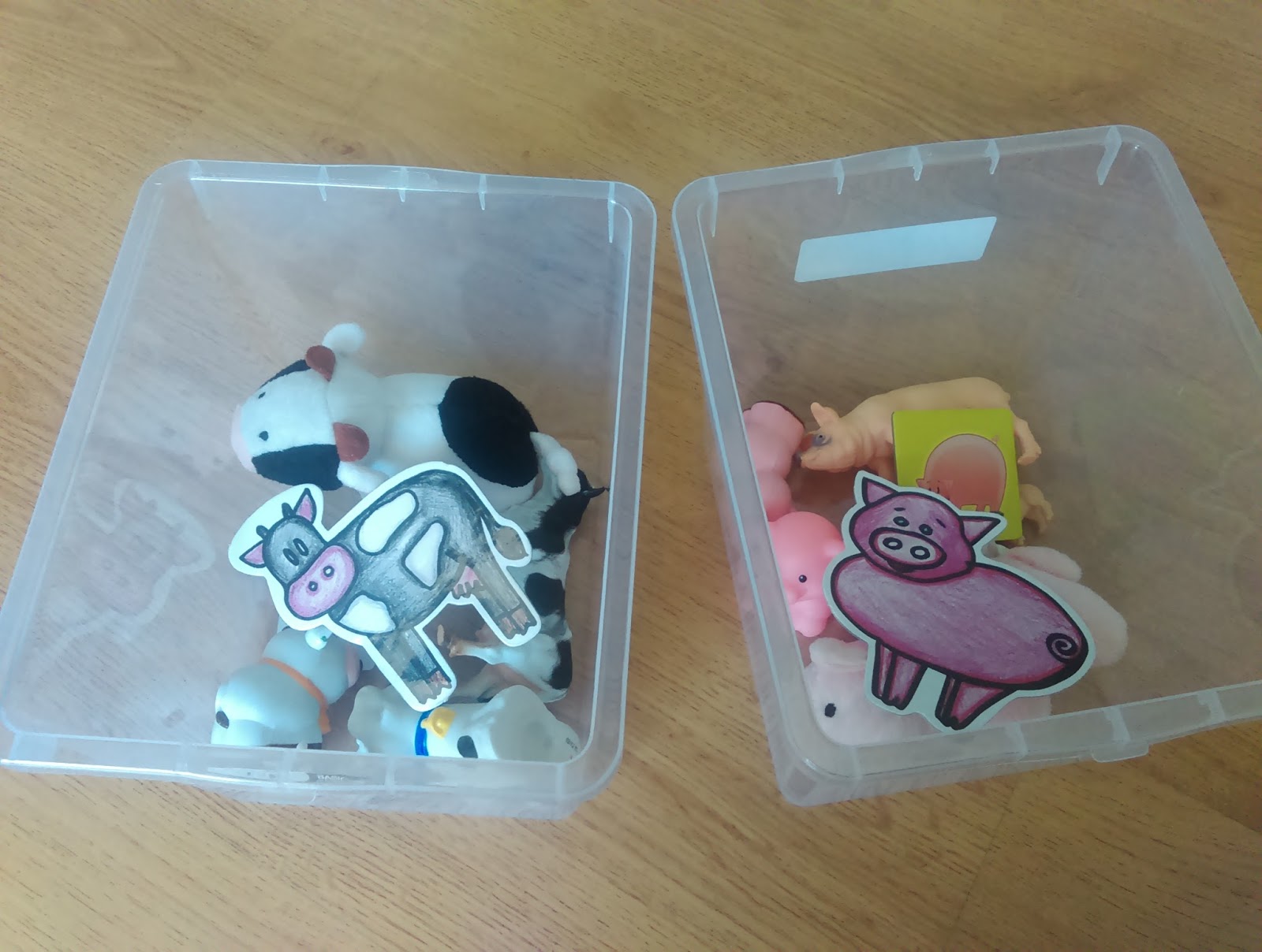Rozdzielamy przedmioty według kategorii. Jak Kopciuszek. Ale zamiast grochu i maku Błażej wrzuca do pudełek świnki i krówki.