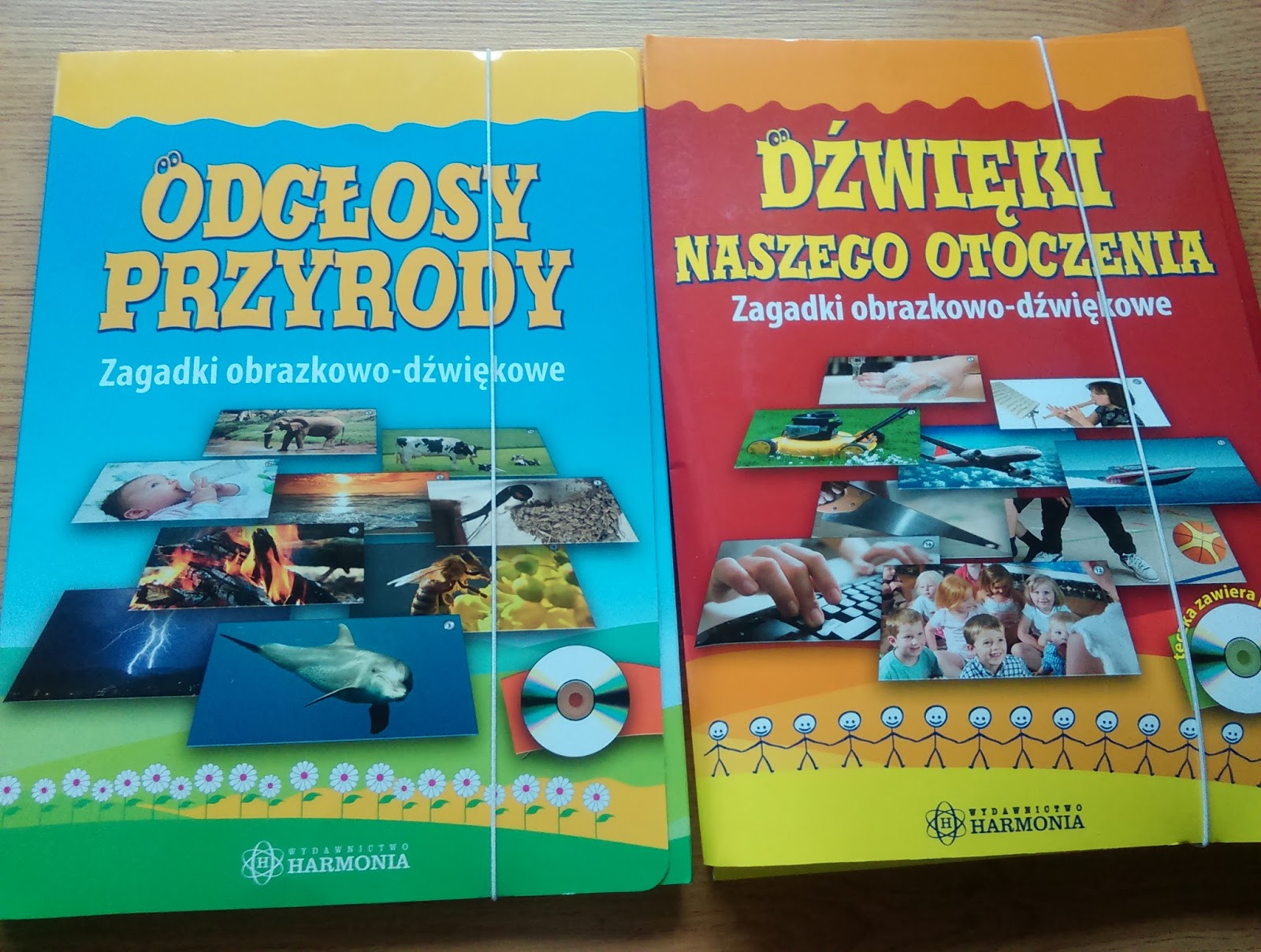 Słuchamy też różnych dźwięków z płyt (śpiew ptaków, bzyczenie pszczół, czy pracująca kosiarka do trawy) i próbujemy dopasowywać do nich obrazki.