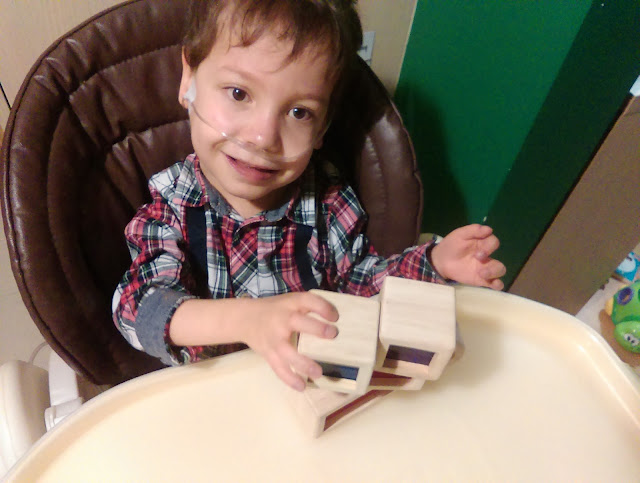 Błażejek bardzo przeprasza za długą nieobecność, ale od ponad miesiąca walczy z zapaleniem, gardła, krtani,tchawicy i nie wiadomo, z czym jeszcze. Nic strasznego się nie dzieje, ale musiał zawiesić zajęcia na jakiś czas, do przedszkola niestety też nie mógł chodzić. Po drodze mama też się zaraziła i tak sobie pochorowaliśmy. Na szczęście wygląda na to, że jest już lepiej i Błażejek nawet mógł wrócić do ukochanego przedszkola na kilka dni przed przerwą świąteczną. Był taki szczęśliwy, że w końcu wyszedł z domu, że nawet zajęcia rehabilitacyjne go bardzo uszczęśliwiły. Próbował też zajęć logopedycznych w zaciszu swojego pokoju, ale wiadomo – z mamą to się odpoczywa, a nie uczy, więc różnie bywało. Błażej zdecydowanie nie jest domatorem i najlepiej pracuje, gdy wychodzi z domu.