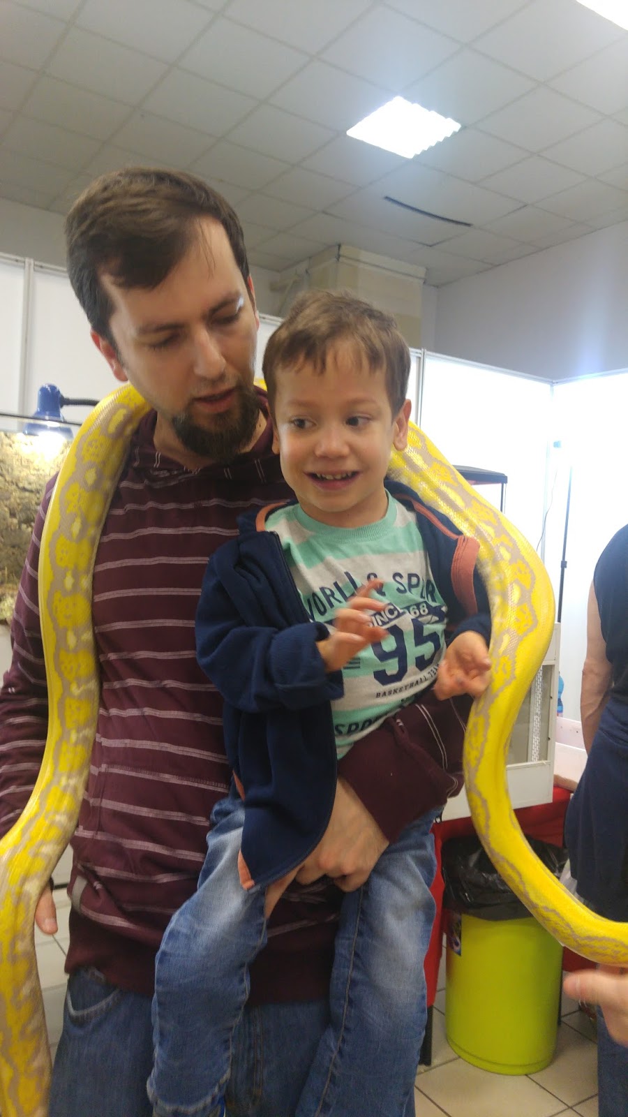 Wchodzimy, Błażej się rozgląda. Czuję, że za chwilę stracimy czterdzieści złotych za które kupiliśmy bilety. Nasz dzielny chłopczyk rozgląda się. Wokół pawie, kaczki, gęsi, owady, psy, koty i gigantyczne króliki. No i oczywiście tłumy ludzi, którzy głośno rozmawiają, przepychają się i chaotycznie chodzą. Teoretycznie Błażejkowi nie powinno się tutaj podobać. W praktyce jest zachwycony! Cały czas się uśmiecha, pokazuje, gdzie tata ma go jeszcze zanieść, z wielkim uśmiechem głaszcze węża.