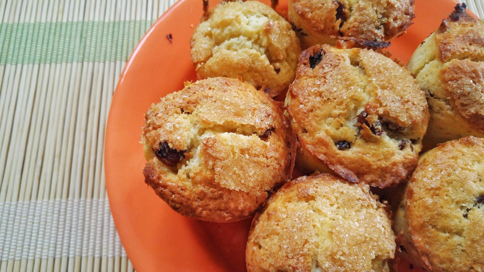 Potem mieszamy zawartość obu misek, dodajemy 60 gramów rodzynek i wkładamy do 6 foremek na muffinki. Posypujemy cukrem trzcinowym (koniecznie! robi się z niego pyszna, chrupiąca skórka).