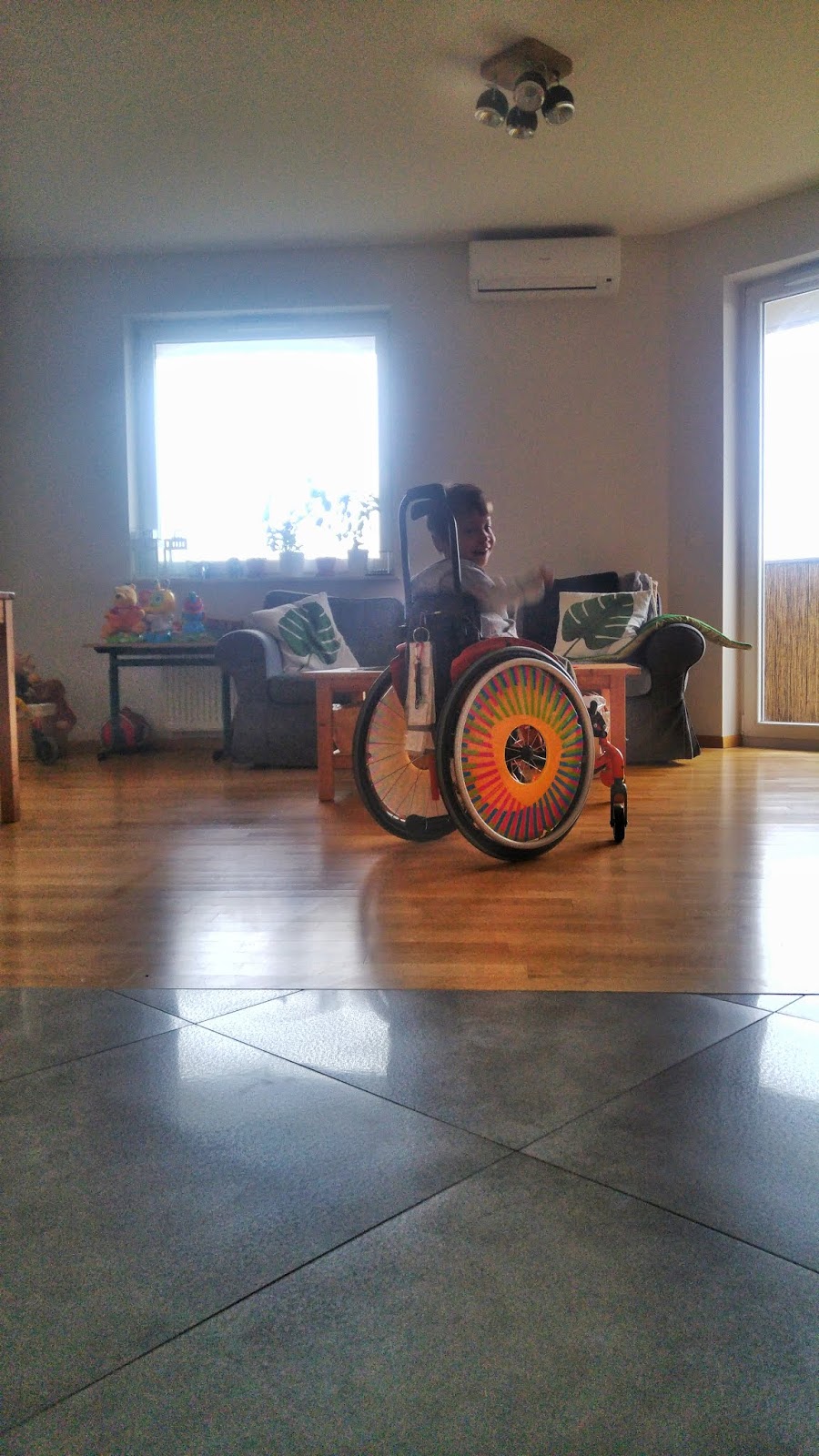 Błażej coraz lepiej i śmielej chodzi z chodzikiem. Jego głównym problemem jest strach. Gdy maluch uczy się chodzić nie myśli o tym, że może upaść. Upada, wstaje, idzie dalej. A Błażej wie, że może upaść i nie podoba mu się ta myśl. Jesteśmy głęboko przekonani, że mógłby chodzić samodzielnie z chodzikiem, bez pomocy człowieka, gdyby się odważył. I że to tylko kwestia czasu, gdy się przełamie.